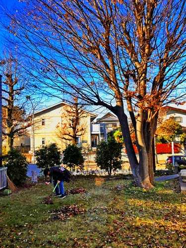 教会の庭先に散らばる 落ち葉を クマデを持って